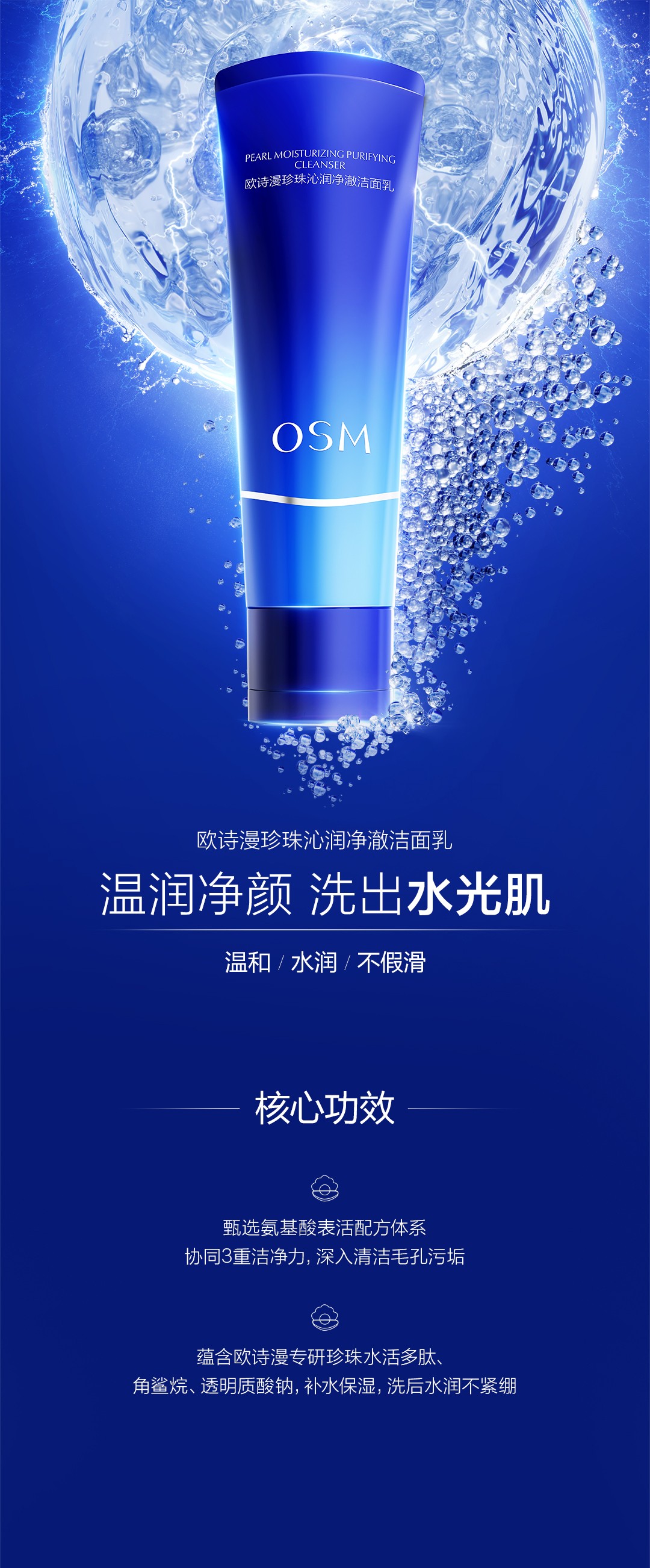 甄選氨基酸表活配方體系,協(xié)同3重潔凈力,深入清潔毛孔污垢 蘊含歐詩漫專研珍珠水活多肽、角鯊?fù)?、透明質(zhì)酸鈉,補水保濕,洗后水潤不緊繃